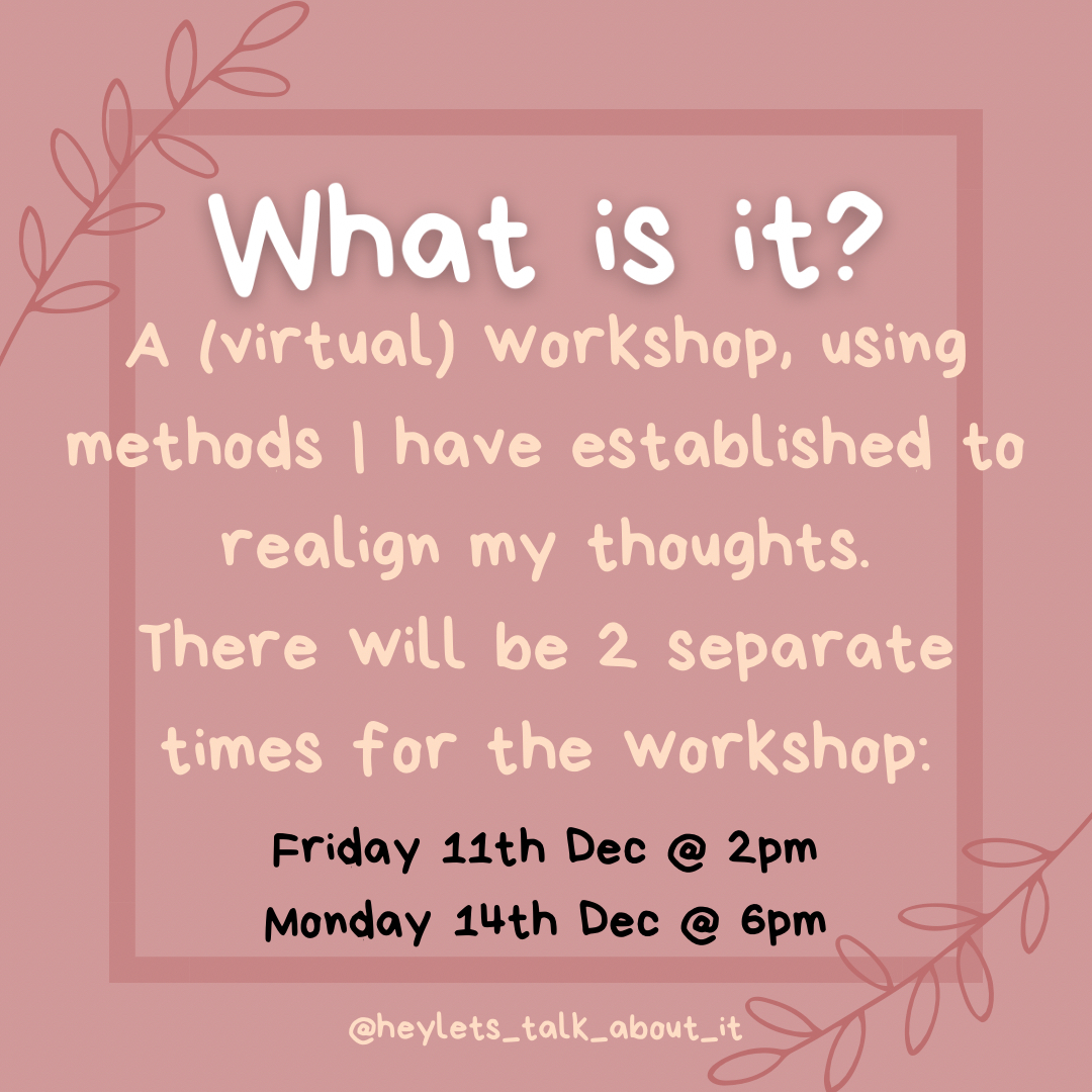 I will be holding another workshop that follows the same structure as this one on Monday 14th December at 6pm (GMT) and will hope to gather more feedback to enable me to develop the Realigning Thoughts Workshops further.