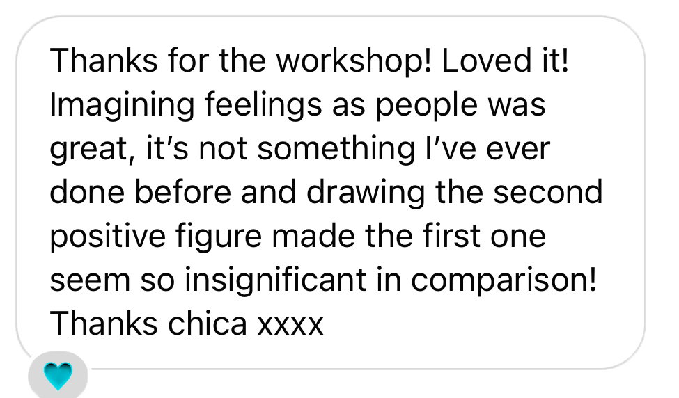 The next stage was personifying the colours/ emotions, answering questions such as, What do they look like? What do they feel? What do they say? It was up the individual how they personify their colours/ emotions, they could use words, drawings or both! The participants found this exercise fun and effective as it draws the emotions away from yourself, allowing them to see the negative thoughts from an outside perspective.