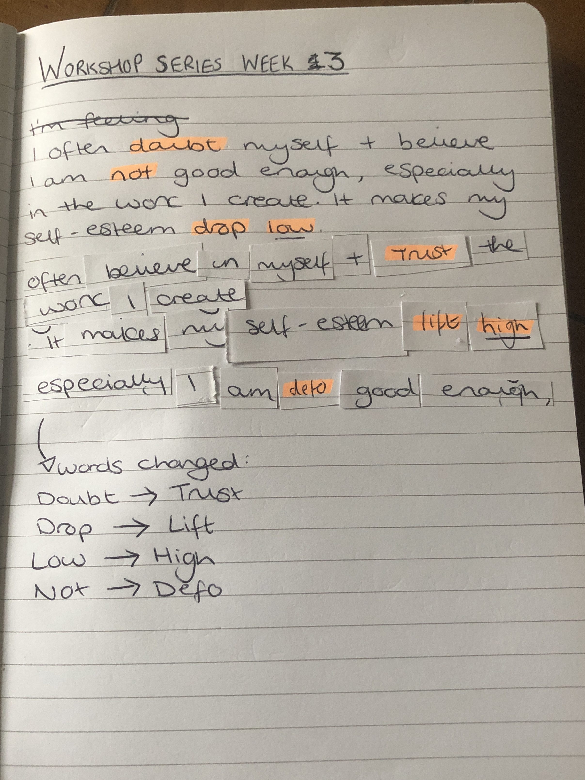 I decided to do the daily rearranging of negative sentences into more positive ones again, as this is essentially where my main project ideas lie. The meaning of starting this daily exercise, which developed throughout my workshops and is continuing to do so, is to understand difficult thoughts and emotions. In order to understand yourself and your mental health, it is necessary to know the causes, trauma and childhood experiences. Taking part in this daily practice again helped to re-situate my project and allow me to take it to the next level.
