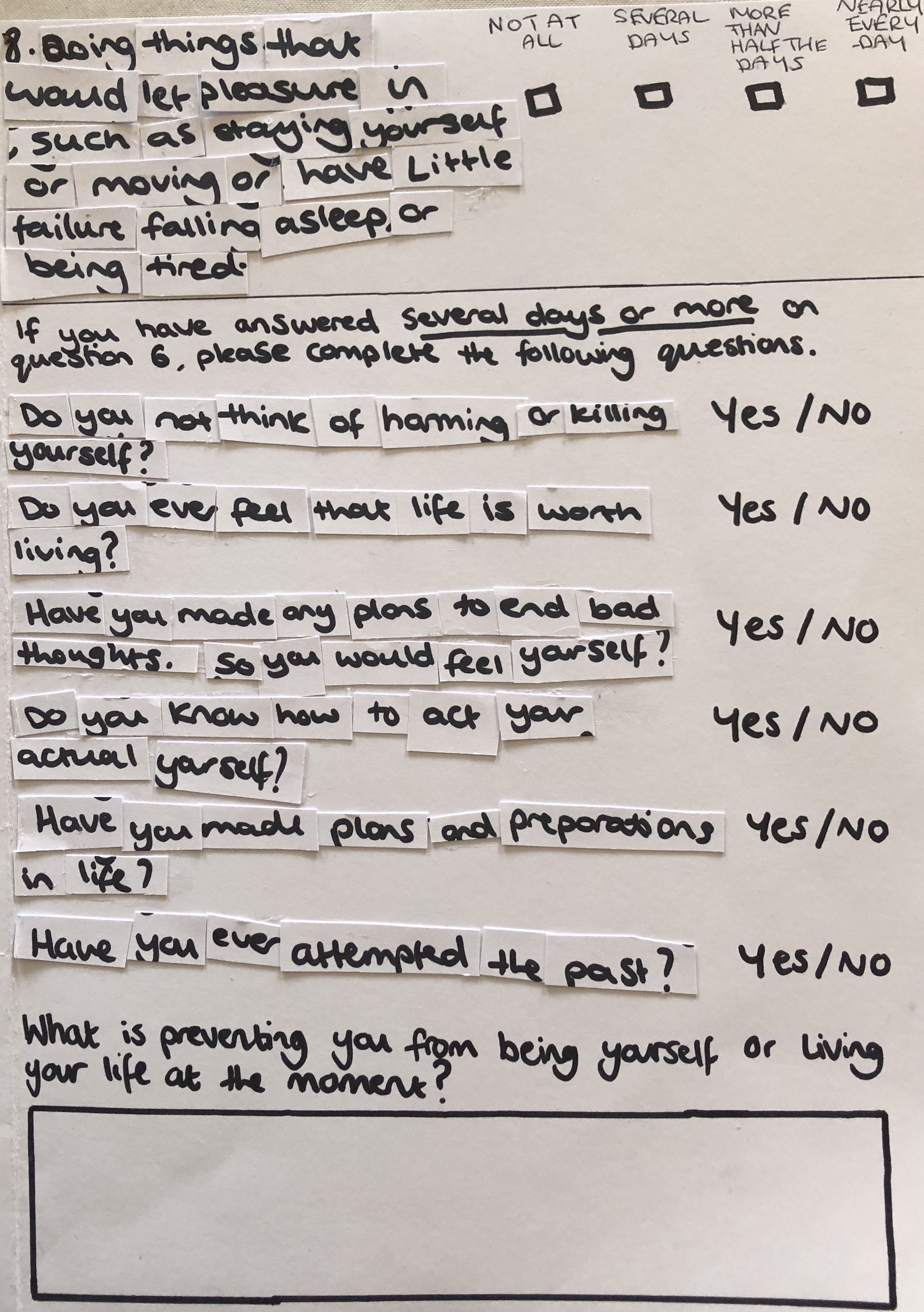 I have further developed this object with enlarging it onto a 110cmX80cm canvas. I created this by painting the canvas white and writing each word on separate pieces of card, sticking them onto the canvas. I am planning to take this to Waterloo in London, to raise mental health awareness.