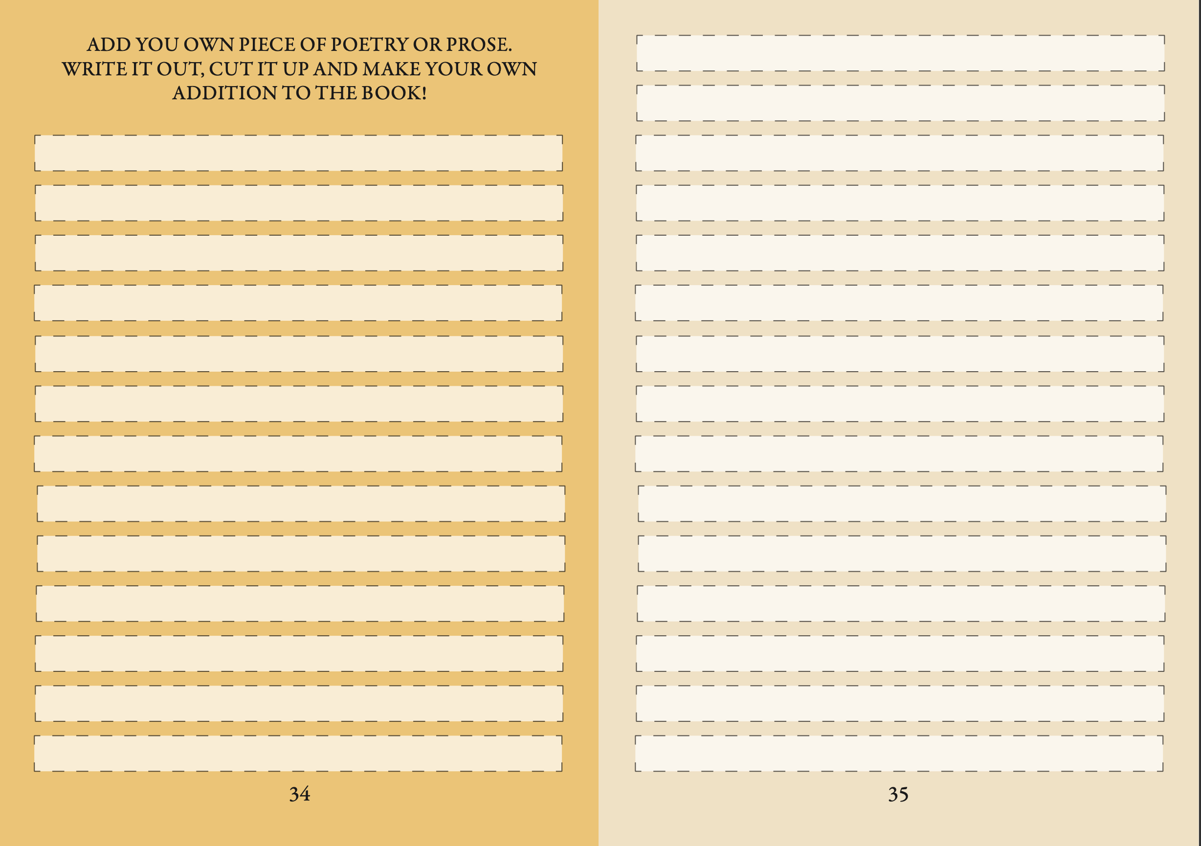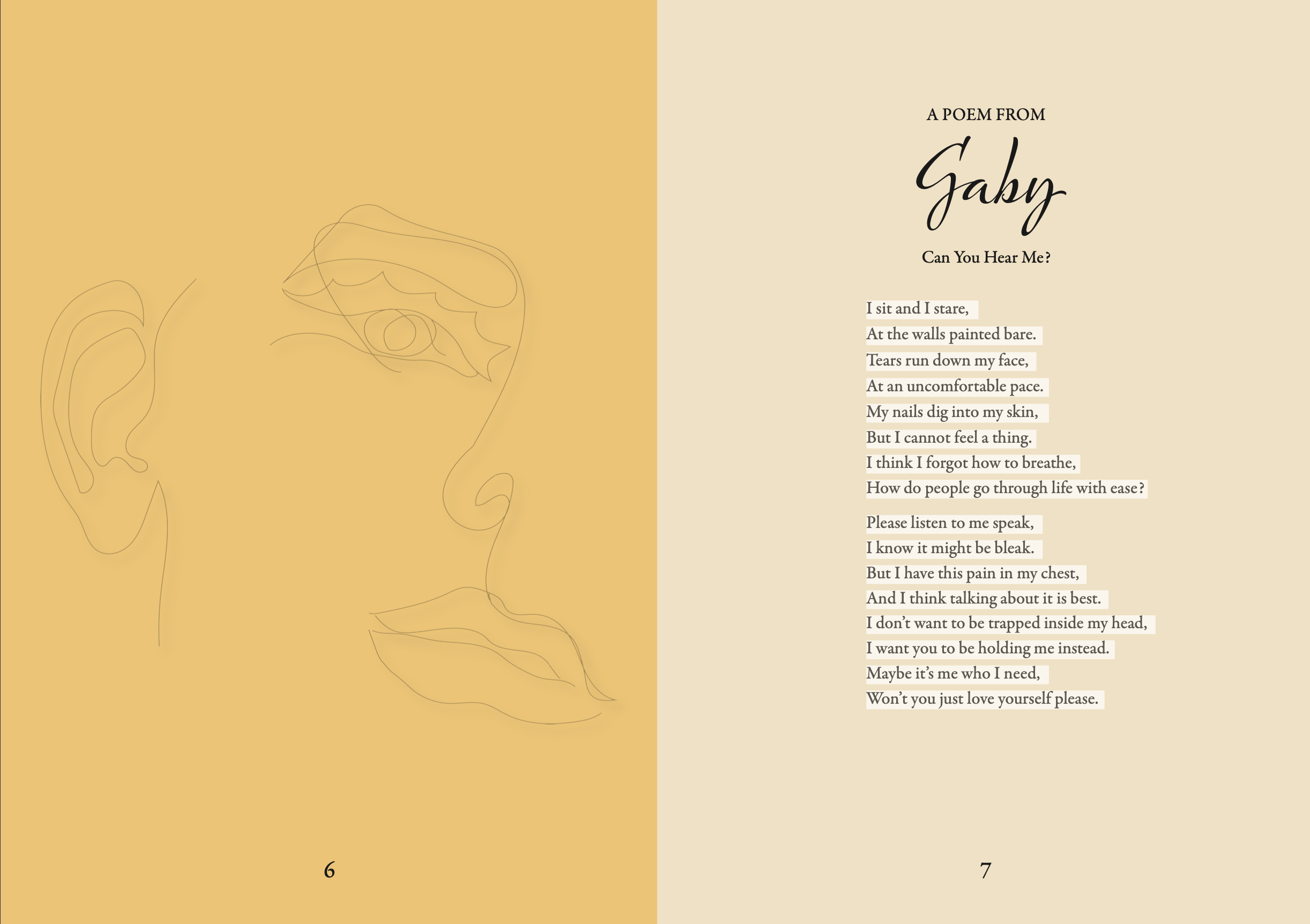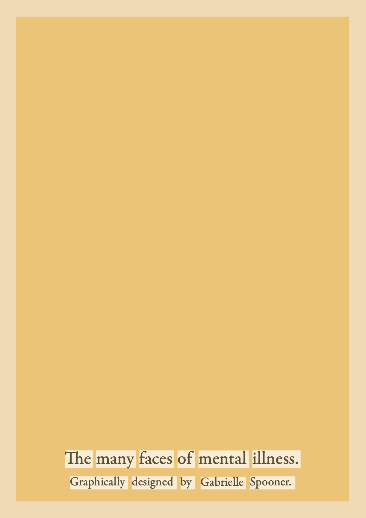 The design of the book is linked to the Realigning Thoughts theme, with each sentence looking like it has been cut-up and rearranged. I chose the book to be shades of yellow, as after a poll held on my Instagram page of, ‘What colour most represents joy for you?’ Yellow won 55% of the votes. Therefore, I decided that yellow would be the most appropriate colour to make the mental health poetry book, as it reflects the positive and warming effect the book
