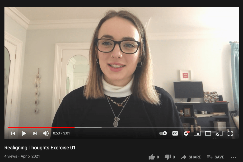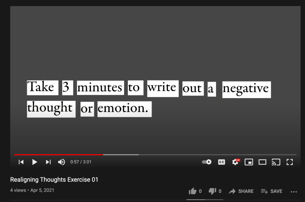 Each video is an exercise from the Realigning Thoughts Workshop Series. I decided to make them all individual & short clips so people can use these methods quickly & effectively. It also allows people to fit them into their busy lives. I believe that people are more likely to part-take in the activities if the videos are short, simple & effective.