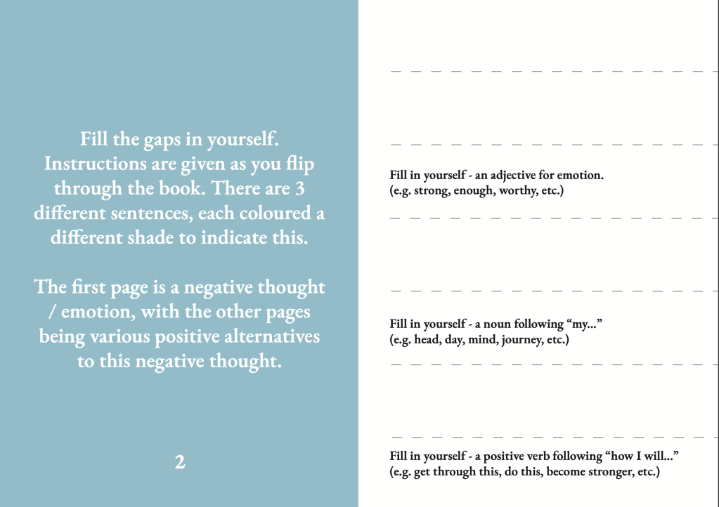 The Mental Health Flip book – the idea of this artefact is to write a negative sentence on the first page and then flip and change each sentence to create new, positive phrases. This allows the individual using it to see all the positive variations of one negative sentence.